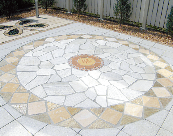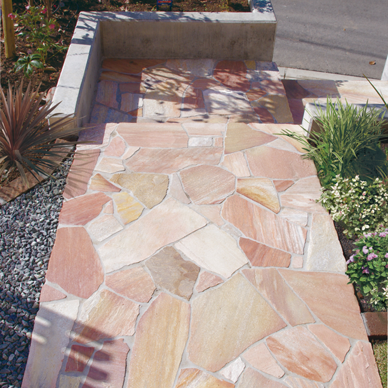 鮮やかな発色が印象的な石英岩の乱形石は和洋のスタイルを問わず、玄関やアプローチ、駐車スペースから植